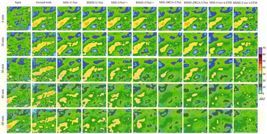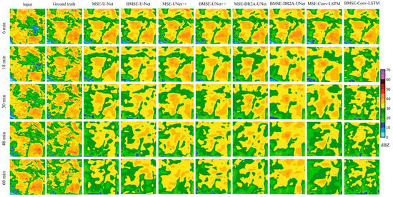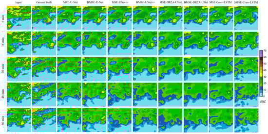 In order to visually compare the extrapolation effect of each model, the 6~60 min prediction effect of a typical echo process was selected for individual case analysis. Figure 6 showed the predicted echoes from 21:00 21 July 2021 to 22:00 21 July 2021, dominated by an echo reflectivity greater than 30 dBZ, with more dramatic local variations. The deep-learning models could predict the details of the echoes and the location of the high-intensity echoes more accurately within a 30 min lead time, but, with the continuation of time, each model showed different degrees of prediction accuracy degradation, and could not accurately predict the formation of the strong echoes above 40 dBZ. The echoes predicted by the model using the MSE loss function had an obvious homogenization tendency, and the contours of the strong echoes were quite different from the actual ones. However, DR2A-UNet with BMSE could predict the formation of localized strong echoes in the image at 60 min, and the location and intensity were closer to the actual. The echo strengths of the 20211005 and 20221001 events were concentrated below 30 dBZ, and the strong echoes developed from west to east. As shown in Figure 7 and Figure 8, in these two rainfall cases, echoes above 30 dBZ appeared only in localized locations in the images. The model using the MSE loss function was unable to accurately predict the changes of the local strong echoes. The model using the BMSE underestimated the strong echoes to a certain extent, but was able to vaguely predict the locations and contours of the strong echoes. The effective prediction time of all the models for the two rainfalls was limited to 30 min.