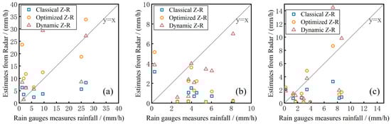 The classical Z-R relationship, the optimized Z-R relationship, and the dynamically optimized Z-R relationship were used to carry out the quantitative rainfall estimation of the actual radar echoes for the three rainfall events and correlate them with the measured rainfall from the rain gauge. The evaluation metrics, as shown in Table 4, showed that the rainfall estimated using the dynamically optimized Z-R relationship had a much smaller error from the actual one and had the highest correlation coefficients of 0.41 and 0.65 for the 20211005 and 20221001 rainfall events, respectively, which demonstrated the superiority of the method in quantitative rainfall estimation. The optimized Z-R relationship improved the correlation coefficients of the nowcasted rainfall to some extent over the classical Z-R relationship, but it still suffered from the larger estimation of rainfall errors overall, and the bias in the calculation of the total rainfall was also larger. Figure 9 shows the scatter distribution of the estimated and measured rainfall. In the 20210721 rainfall event, the rainfall estimated by the classical Z-R relationship was generally located below the 1:1 line, indicating that there was a general underestimation of rainfall by the method, while the rainfall estimated by the optimal Z-R relationship was generally overestimated, with most of the points above the 1:1 line, and the dynamic Z-R relationship could result in the estimated rainfall to be more uniformly distributed in the area around the 1:1 line. All three methods had an underestimation of rainfall in the estimation of the 20211005 and 20221001 rainfall events, with most of the points below the 1:1 line, which also led to smaller correlation coefficients for the estimated rainfall, due to the generally weaker echo intensities of these two rainfall events and the smaller rainfall intensity; however, the use of the dynamic Z-R relationship resulted in a lower underestimation of rainfall and a more accurate estimation. Therefore, the dynamic Z-R relationship was used in the subsequent calculations to realize the rainfall nowcasting.
