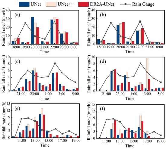 Figure 10 shows the nowcast rainfall process of each model. The maximum rainfall intensity could be captured for the 1 h-lead-time rainfall nowcasting. There were some differences in the hour-by-hour rainfall nowcasting results of different deep-learning models, and DR2A-UNet nowcasted smaller rainfall anomalies and the maximum hourly rainfall was closer to the actual, which was the reason why the nowcasted rainfall had a better correlation and smaller error. For the 20210721 rainfall event, the forecasted maximum rainfall intensity and its occurrence time are consistent with the actual rainfall, but there is a 1 h time lag for the heavy rainfall occurring at 19:00. For the 20211005 and 20221001 rainfall events, of which the duration and intensity are small, the forecasted maximum rainfall intensity is consistent with the actual results, and the occurrence time of the maximum rain intensity of 20211005 event could be accurately forecasted. However, there is a large time lag for the forecasted peak rainfall intensity of the 20221001 event. The main reason is the systematic error of the dynamic Z-R relationship algorithm, which calculates the error discriminant function based on the actual rainfall of the previous time period to obtain the quantitative precipitation estimation parameter for the current time period, which leads to the underestimation of the strong rainfall and overestimation of the weak rainfall for rainfall events with drastic changes in the process, generating outliers [26]. There was a rainfall process bias between the nowcasted rainfall and the actual rainfall for the 2-h lead time, and a large time error between the occurrence of the nowcasted rainfall peak and the actual. The underestimation of the rainfall in each lead time was also more significant, which was consistent with the larger FAR. The models also had a large discrepancy in the nowcast of the hourly rainfall, which led to the correlation coefficients of the 2 h-lead-time rainfall generally being smaller.