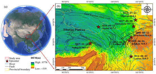 Seismic and tectonic characteristics in the study area. (a) Location of the study area in Eurasia. The Earth picture is sourced from Google Earth accessed on 2 May 2023. (b) Topographic features, fault distribution, river networks, and recently occurring catastrophic earthquakes in the study area.