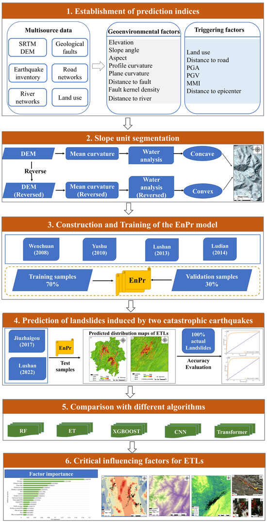 Figure 2 shows the technical route for near-real-time prediction of ETLs, and it consists of five main steps. (1) The geoenvironmental and disaster-inducing factors are extracted from the multisource data to establish prediction indices. (2) The study area is segmented into slope units by a surface curvature watershed method. Slope units can well portray the topographic constraint to landslide occurrence, reflect the control of water systems to landslide development, and avoid meaningless fragmented patches in the prediction result. Thus, the utilization of slope units can effectively improve ETL prediction accuracy. (3) Four earthquakes—2008 Ms 8.0 Wenchuan, 2010 Ms 7.1 Yushu, 2013 Ms 7.0 Lushan, and 2014 Ms 6.5 Ludian—are employed to construct and train the EnPr model. (4) The EnPr model is used to predict the ETL distribution of two earthquakes: 2017 Ms 7.0 Jiuzhaigou and 2022 Ms 6.1 Lushan. All actual coseismic landslides induced by the two earthquakes are adopted to validate the accuracy of the EnPr model. (5) The EnPr model is compared with the RF, extremely randomized trees (ET), XGBoost (1.6.2), CNN, and Transformer models to demonstrate its performance superiority.