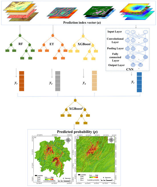 Architecture diagram of the suggested EnPr model. The prediction index vector u contains geoenvironmental and triggering factors. , , , and are the predicted values of the RF, ET, XGBoost, and CNN models, respectively. p is the predicted probability value of the ensemble model EnPr (i.e., XGBoost1, this subscript 1 is to distinguish it from the previous XGBoost. ). (a,b) are spatial distribution prediction of landslides triggered by the Jiuzhaigou and Lushan earthquakes, respectively.