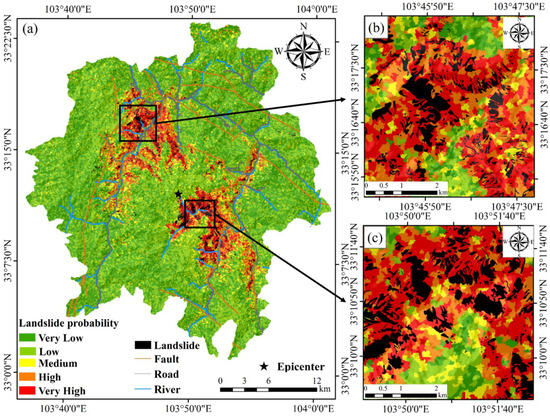Spatial distribution prediction and factual location of landslides triggered by the Ms 7.0 Jiuzhaigou earthquake. (a) Meizoseismal region with dense coseismic landslides. (b) A magnified representation of the landslide-dense region in the northwest. (c) A magnified representation of the landslide-dense region in the southeast.