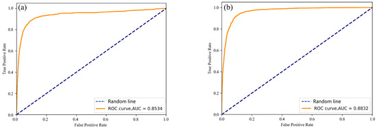 ROC curves and AUC precision values of coseismic landslide prediction for two newly occurring earthquakes. (a) Jiuzhaigou earthquake. (b) Lushan earthquake in 2022. The closer the ROC curve is to the upper left corner, the higher the accuracy; the closer the AUC value is to 1, the higher the accuracy.