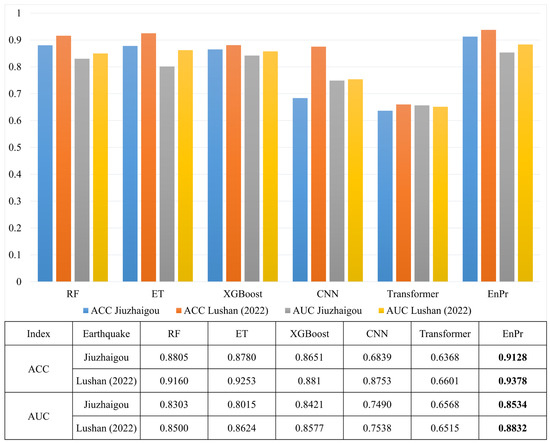 Comparison of ACC and AUC precision values among six prediction models for the Jiuzhaigou and Lushan (in 2022) earthquakes.