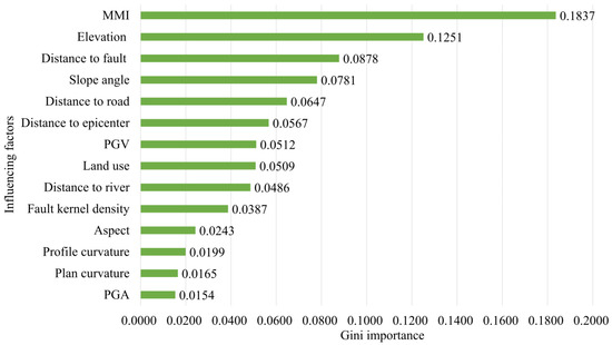The disaster-triggering factors involve the seismic and human engineering activity factors. (1) As for earthquakes, the factors of PGA and PGV reflect the propagation of seismic waves, and the factors of MMI and distance to the epicenter embody the strength and intensity of ground motion. Thus, the seismic factors illuminate the destruction of seismic waves to the ground and slope surfaces [41]. (2) As to human engineering activities, the factor of distance to roads indicates the excavation to slope feet and the damage to rock and soil intactness. The stress redistribution within a slope may change the seepage field and generate new seepage channels. The infiltrated rainwater aggregates on the impervious surface, saturates rock and soil mass, and softens the sliding surface [42]. Therefore, the slopes beside roads are apt to fail and evolve into landslides under the function of express pore water pressure when suffering from a violent earthquake. The factor of land use depicts the intensification and types of human engineering activities before an earthquake. The artificial excavation [43,44,45] and explosion in urban construction cause plenty of cracks within a slope, and the exposed debris features a strong water permeability and is easily weathered to become fractured. Moreover, cropland irrigation results in irrigation water penetrating into the soil and the increase in porewater pressure, so the shear strength of slope mass significantly reduces [42]. Therefore, the slopes undergoing intensive human engineering activities are characterized by relatively poor stability and may develop into landslides under strong earthquake ground motion.
