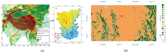 (a) Large-scale atmospheric circulation and topographic maps (in meters) of TP and the location of the LHAASO. The pentagram means LHAASO site, and the black rectangle around the LHAASO denotes the Hengduan Mountains. Topographic map of Hengduan Mountains [21]. The pentagram means LHAASO site, solid circle represents the Shangri-La station and solid triangle indicates Litang station; brown curves denote the rivers in Hengduan Mountains; different colors means different altitudes (in meters). (b) Geomorphological map of LHAASO (adopted from MOD12Q1 products) (0 for water, 1 for evergreen needle leaf, 2 for evergreen broad leaf, 3 for deciduous needle leaf, 4 for deciduous broad leaf, 5 for mixed forests, 6 for closed shrub lands, 7 for open shrub lands, 8 for woody savannahs, 9 for savannahs, 10 for grasslands, 11 for permanent wet lands, 12 for croplands, 13 for urban and built up, 14 for crop nat veg mosaic, 15 for snow and ice, 16 for barren or sparse, 17 for unclassified).