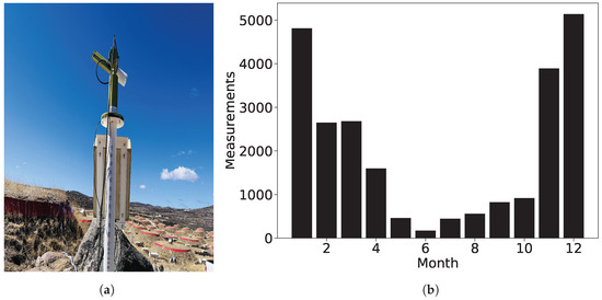 (a) CE318-T in the field observations. (b) The number of measurements vs month; some months may have less data because of the cloudy weather.