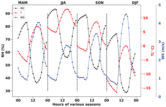Seasonal diurnal variations in temperature (in red), relative humidity (in black) and wind speed (in blue) during the observation period.