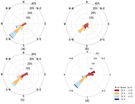 Wind rose plots in different seasons. Hourly horizontal wind direction (WD) was used, with its radii values expressed as percentages for wind blowing from particular directions. (a) Spring; (b) summer; (c) autumn; (d) winter.