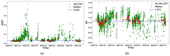 (a) Time series of AOD. (b) Time series of AE. Green symbols represent the instantaneous measurements taken at 15 min intervals. Red symbols are the median of 100 consecutive measurements for standard deviation < 0.02 within 4∼5 days. The blue horizontal line denotes the baseline AOD (AE) value calculated.
