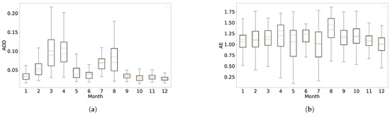 (a) Box plot of AOD440nm. (b) Box plot of AE440–870nm. The dotted green line is the mean, the solid orange line is median and the lower and upper bar of the box are first and third quartiles. The lower segment is minimum value, and the upper segment is maximum value.