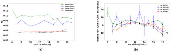 Diurnal daytime variation of AOD440nm (AE440–870nm) in 4 seasons at LHAASO. The local time is 1.2 h later than Beijing time. (a) AOD440nm. (b) AE440–870nm.
