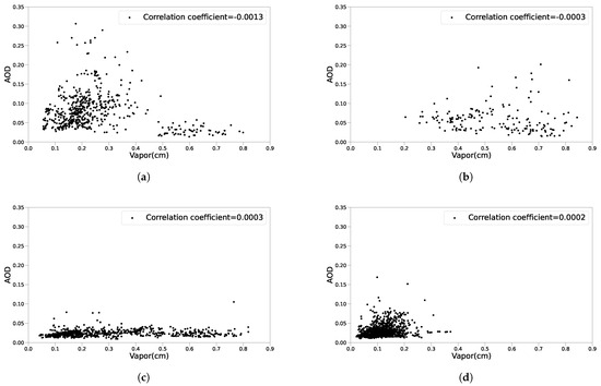 Relationship between AOD440nm and water vapor content during the observation period. (a) Spring; (b) summer; (c) autumn; (d) winter.