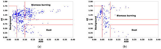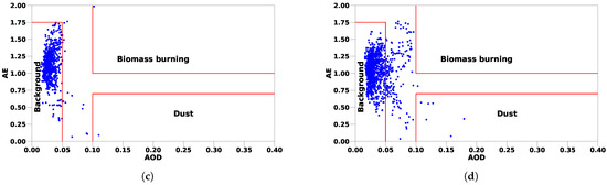 The threshold method for classifying aerosol types based on AOD and AE observations in the TP was developed by Manisha Pokharel [36]. Following this approach, we used AOD at 440 nm wavelength, categorizing AOD < 0.05 with AE < 1.75 as clean continental background aerosols and AOD > 0.1 with AE > 1.0 as biomass burning aerosols. Continental background aerosols comprised fine and coarse mode mixtures, with a wide range of AE. Dust events, occasionally appearing over the TP, are characterized by AOD > 0.1 and AE < 0.7. The remaining cases are considered undetermined or mixed, mainly due to the effects of various aerosol mixing processes occurring in the atmosphere. The boundary lines for different aerosol types are described with red color as shown in Figure 9.
