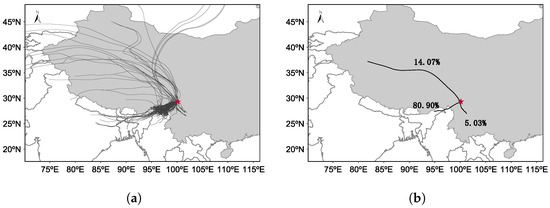 AOD ≥ 0.096 trajectory screening throughout the year with a starting height of 900 m. The red pentagram symbol represents the location of LHAASO, and the shaded part represents China. (a) backward trajectory; (b) trajectory clustering.
