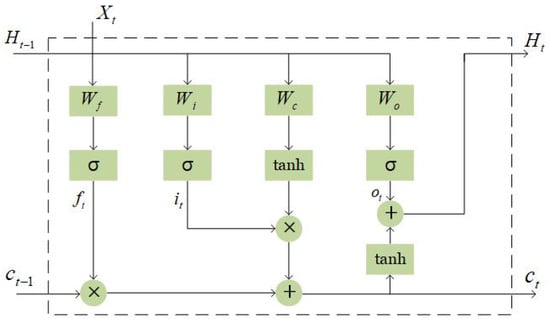 where represents the weights and represents bias coefficients. represents the final output at time point , which will be input at time point along with cell state . Here, ‘⊗’ denotes the convolution operator, and ‘*’ denotes the Hadamard product.