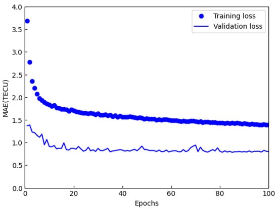 In this study, the Python 3.9.16 programming language was utilized to write deep learning code based on the Keras library. The neural network was constructed using this framework and trained on a server equipped with NVIDIA A100 GPUs and 83.5 GB of RAM. The whole neural network structure can be divided into three parts. The first part is the encoder, which is the combination of the convolutional layer and the pooling layer. This design can effectively extract the spatial key features of the input GIM, which means fewer network parameters and a faster training process. The second part consists of a ConvLSTM network, which can extract the time series features of TEC maps, and a batch normalization layer used to prevent overfitting and normalize data. The last part is the decoder, which consists of an upsampling layer and a convolutional layer corresponding to the encoder. The input is 24 GIMs with a time accuracy of 1 h from 00:00 UT to 23:00 UT. The output is the same GIM on the next day. The activation function of the convolutional layer is the Exponential Linear Unit (Elu) function. The loss function was MAE, and the optimizer used the improved Adamax algorithm that adaptively adjusts the learning rate [39]. The batch size was 32, while the number of training rounds was set to 100. Deep learning code is written using Python and the high-level abstraction of the Keras library (with TensorFlow as the backend) to construct the neural network. By continuously adjusting the kernel size and number of filters for each layer, a well-trained model is obtained. Figure 2 shows the change curve of the loss function during the training process. It can be observed that both the validation set error and training set error gradually decrease with the increase in training epochs and eventually stabilize.