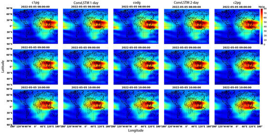 Figure 3 shows the 1 h interval global TEC maps predicted by c1pg, c2pg, and ConvLSTM models, along with the ground truth during geomagnetic quiet day. The figures showed that all TEC maps from c1pg, c2pg, and ConvLSTM are well in agreement with the ground truth. In addition, the ConvLSTM is closer to the truth than c1pg and c2pg maps where TEC is enhanced on the day side. For example, the TEC enhancement showed around 80°E–120°E longitude, 0°–20°S latitude is well reproduced in the ConvLSTM, while the c1pg and c2pg cannot reflect it. By using Formula (7) for calculation, we obtained the RMSE of c1pg on 5 May 2022 as 3.32 TECU, the RMSE of c2pg is 3.63 TECU, while the RMSE of ConvLSTM 1-day is 3.03 TECU, the RMSE of ConvLSTM 2-day is 3.06 TECU. This shows that the error between the predicted results of ConvLSTM and the actual TEC data is better than that of c1pg and c2pg. As expected, the 1-day predicted TEC maps of both ConvLSTM and those released by CODE are closer to the ground truth than the 2-day predicted.
