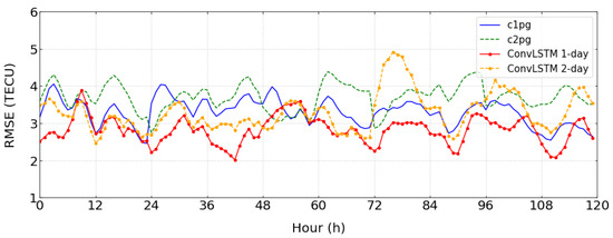 Figure 4 shows a comparison of hourly RMSE error between global ionospheric TEC maps released by CODE and ConvLSTM during some geomagnetic quiet days. Whereas the 95% confidence interval for c1pg is ±0.06, for c2pg it is ±0.07, for ConvLSTM 1-day model is ±0.06, and for ConvLSTM 2-day model is ±0.09. The results show that our ConvLSTM 1-day model outperforms the c1pg model, as it has a smaller RMSE. Similarly, the c1pg model has a smaller RMSE than the c2pg model, indicating that our ConvLSTM 1-day model has a better prediction ability. Moreover, our ConvLSTM 2-day model performs similarly to the c2pg model in terms of performance. Furthermore, the RMSE of ConvLSTM shows an obvious decline about every 12 h during geomagnetic quiet days.