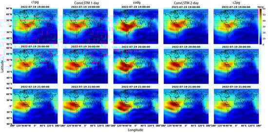 Figure 5 displays a comparison of 1-h interval TEC maps during the main phase of a geomagnetic storm event from UT 19:00 to UT 21:00, 19 July 2022, during which the Dst index declines to −62 nT. The figure shows the ConvLSTM prediction along with the global ionospheric TEC maps released by CODE and the ground truth. The plots reveal that the maps predicted by the ConvLSTM model for 1-day and 2-day intervals are more accurate than those generated by c1pg and c2pg, as they exhibit closer proximity to the ground truth. The TEC enhancement showed a latitude near 0°N–30°N on the day side, which is captured by the ConvLSTM model, while c1pg and c2pg fail to reflect it. By using Formula (7) for calculation, we obtained the RMSE of c1pg on 19 July 2022 as 4.4 TECU, the RMSE of c2pg is 4.22 TECU, while the RMSE of ConvLSTM 1-day is 3.41 TECU, the RMSE of ConvLSTM 2-day is 3.98 TECU. Moreover, the prediction results from ConvLSTM in Figure 2 are more consistent with those from the truth compared with Figure 4, indicating the prediction capability performance of c1pg, c2pg, and ConvLSTM decrease as the storm level increases.