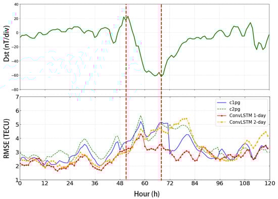 Figure 6 shows the Dst variations during 17–21 July 2022, where the minimum reaches −62 nT, comparing the hourly RMSE error from ConvLSTM 1-day and c1pg for the storm time. The 95% confidence interval in the figure for c1pg is ±0.14; for c2pg it is ±0.16; for ConvLSTM 1-day model is ±0.1, and for ConvLSTM 2-day model is ±0.17. It can be seen that the presented results demonstrate a high level of statistical credibility. In general, the ConvLSTM model shows smaller RMSE than c1pg during the main phase of the storm events. The performance of ConvLSTM prediction is better than c1pg, especially during the main phase of the storm event, indicating an improved prediction capability for the storm time. However, the performance of the 2-day prediction of both the c2pg and ConvLSTM model during the main phase of a geomagnetic storm event is not very satisfactory.