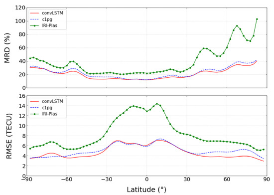 Figure 7 illustrates the variation of RMSE and MRD in the test dataset for the year 2023 as latitude changes. The 95% confidence interval of the RMSE in the figure for c1pg is ±0.025, for the ConvLSTM 1-day model, it is ±0.024, and for the IRI-Plas model, it is ±0.044. Notably, the ConvLSTM model demonstrates the lowest error. It is evident that the ConvLSTM model outperforms c1pg notably in mid-latitudes. All three models exhibit pronounced latitude-dependent RMSE errors, a phenomenon that might be linked to Equatorial Ionization Anomaly (EIA). In high-latitude regions, GIM-TEC values are often very small or even zero, resulting in larger MRD values.