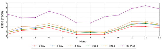 Figure 8 displays the temporal variations of RMSE for different forecast days, revealing a periodic change. The 95% confidence interval in the figure for c1pg is ±0.023; for c2pg it is ±0.024; for ConvLSTM 1-day model is ±0.022; for ConvLSTM 2-day model is ±0.025, for ConvLSTM 3-day model is ±0.027, and for IRI-Plas model is ±0.033. In the performance of the whole year, the RMSE of ConvLSTM 1-day is the smallest, the prediction performance of ConvLSTM 1-day is better than c1pg, and the prediction performance is the best. Additionally, as the number of days being forecasted increases, the RMSE value also tends to increase, indicating a decrease in the predictive accuracy of the ConvLSTM model over longer forecast horizons. The prediction effect of the model is related to the season, and the RMSE value in the northern hemisphere summer is smaller than that in spring, autumn, and winter. It is well known that the ionosphere is more stable in summer due to longer periods of solar irradiance. In other seasons, however, dynamical processes become significant, leading to poor results for any prediction method based on previous observations.