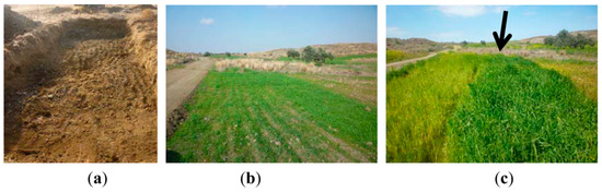 (a) Photo from the construction of the controlled archaeological environment located at the Alampra village. (b) The area was then cultivated with barley crops. (c) Photo of the barley crop during its full growth. The linear cropmarks formed in the area above the archaeological environment are shown with an arrow (source [32]).