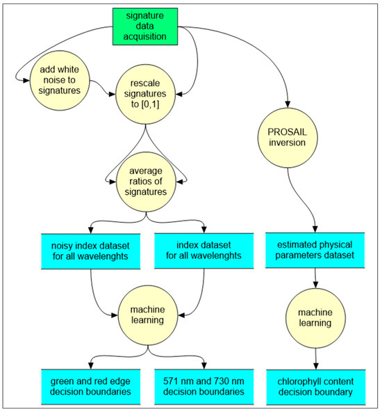The overall methodology adopted for the needs of this study is depicted in Figure 2. Once the datasets have been collected, they are quantitatively processed (rescaled to the unit interval and forming the average of the ratio of every signature to any other in the dataset) to facilitated classification. Using machine learning algorithms, specifically decision trees [34], we identify two new (single wavelength) indices and the associated thresholds (decision boundaries), which optimally classify the dataset into healthy and stress vegetation spectral profiles (H and A, respectively). Taking into consideration the noise impact, the new indices and thresholds were produced based on the suitable spectral windows. Finally, the physically based model PROSAIL was used to estimate physical parameters and identify decision boundaries associated with them. This analysis singles out the leaf chlorophyll content as the physical parameter that can be effectively used for classification purposes.