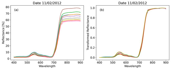 Measured and transformed A reflectance curves for a given day, indicated with a different colour. (a) Spectral signatures are captured from the spectroradiometer and (b) transformed reflectance curves based on Equation (1).