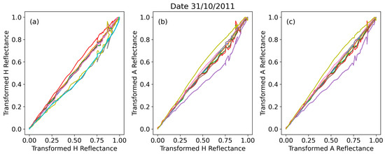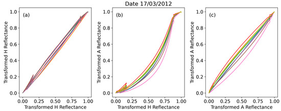 Let us now plot the (transformed) reflectance curves against each other, which we may call reflectance-against-reflectance plots. In Figure 4, for a given day of observation (17 March 2012), the A and H reflectance curves are plotted against each other, in all distinct combinations of A and H in the following manner: in Figure 4a, all H measured curves of the day are plotted against a single H curve, which serves as the horizontal axis. Similarly, for the other two figures (all A against a single H in Figure 4b and all H against a single H curve in Figure 4c.).