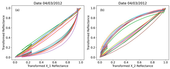 Analysis of an ‘unknown’ dataset via inspection: Reflectance-against-reflectance curves for observation X_1 against all the observations in the given date. X_1 and X_2 can be identified as (a) A and (b) H, respectively, based on their pattern.