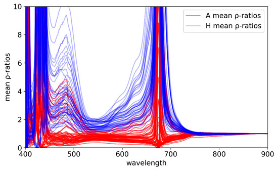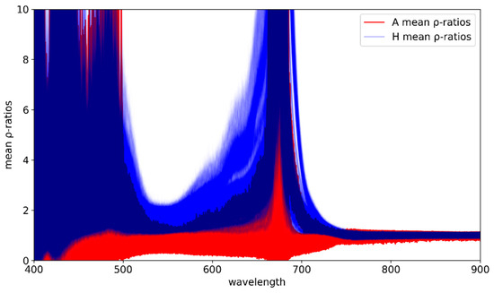 The mean ρ-ratios for all observed reflectance curves and for all wavelengths are shown in Figure 8. One may then discover by mere inspection that in the vicinity of the peak of the original reflectance curves in the visible spectrum, i.e., near 560 nm, there is very clear separation between the A and H mean ρ-ratios. We should emphasize again that this fact survives for all small values of the cutoff, which primarily affect these curves near the blue and red edges.