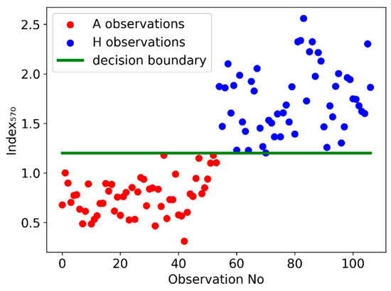 In Figure 9, we plot this index for all observations. We find that there is indeed a distinctive decision boundary between A and H observations at the value Index570 = 1.2 (rounded to one decimal point).