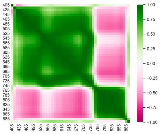 To simplify our analysis, we group the wavelengths between 400 and 900 nm (covering the visible to near-infrared part of the spectrum) into bands of 10 nm averaging the values of the mean ρ-ratio in every band. We use the central points of the bands, i.e., 405, 415,…,895, as the name of the corresponding feature (variable), reducing the number of the features to 50. We first calculate the 50 × 50 correlation matrix of the features, which is visualized in Figure 10.