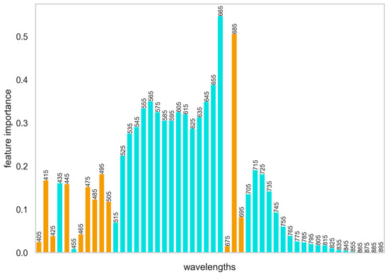 After reshuffling, we split the available datasets of 107 observations into 85 observations (80%) for the training set and 22 (20%) for the validation set. The obtained model performance is again given in Table 2, achieving perfect scores. It should be noted, though, that the 10 nm bands appear to be the coarser resolution producing the best results: with bands of 20 nm, scores are lowered to 96%. The importance of every feature (wavelength), that is, the coefficients of the fitted logistic regression model, is shown in Figure 11.