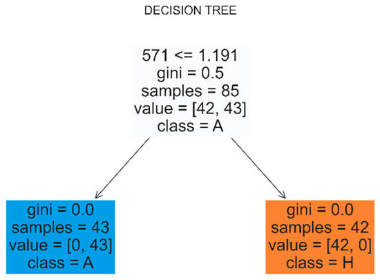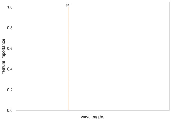 Decision tree classifiers are more pertinent to the problem at hand, as the method finds decision boundaries examining sequentially its features [34,36]. Moreover, the relatively small size of the dataset and the rather low number of degrees of freedom, as well as the ‘white-box’ interpretability of decision trees [37], make this classification method a suitable approach for the current purpose. Indeed, again constructing a training and validation set and using gini impurity as a measure of the quality of the splits, we find that for a simple depth equal to 1 (one node), there is a decision boundary, a single dominant feature at 571 nm, i.e., the only wavenumber with a non-zero weight and equal to 1 (Figure 12), and a decision boundary (threshold) of 1.191, as shown in Figure 13, where our decision tree is visualized. This is in accordance with our expectations from the analysis that led to the Index570 and the associated decision boundary. The decision tree classification allowed us to validate and refine that analysis, as well as to deduce these results in a systematic way, i.e., through an algorithm instead of inspection.