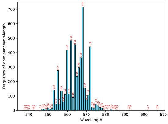 The distribution of the dominant wavelength (frequency of appearance) is presented in Figure 15. On top of every bar is the mean value of the threshold for that wavelength. The wavelength 568 nm is the most frequently arising wavelength of the distribution, but there are other values with significant rates of appearance. Table 5 shows certain important percentiles of the distribution. We see that between the 5th and 95th percentile there are many wavelengths that arise with a significant probability.