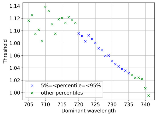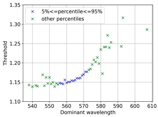 Inspection of the threshold values in Figure 15 shows that the threshold values increase with the wavelength in this part of the spectrum. This is shown more concretely in Figure 16, where one may see a very distinct trend in (roughly) the 5–95th percentile interval of the wavelength distribution. Outside this interval, the events in every wavelength are too few; hence, the (plotted) mean value of the threshold fluctuates a lot even over 5000 simulations.