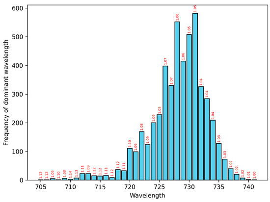 Histogram of the dominant wavelength values for the 5000 simulations. On top of every bar is the mean value of the threshold for that wavelength.
