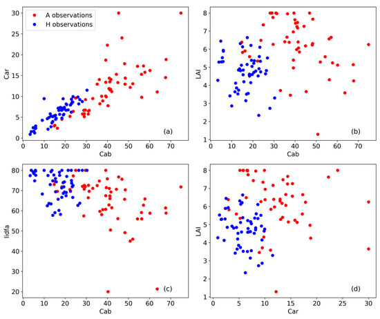 In this section, we present a preliminary work relating the physical properties of vegetation and canopy with the A and H classification. We use plausible values and ranges for the PROSAIL input parameters based on the literature [39,41], which are given in Table 11.