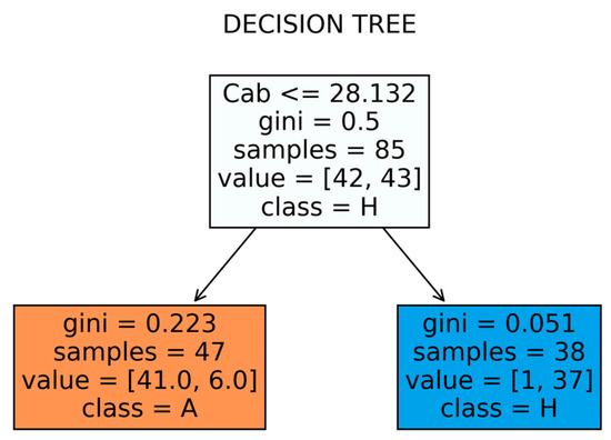 Hence, physically based classification is expressed in terms of a one-dimensional decision boundary for the chlorophyll content Cab parameter. That boundary (the threshold value for the split) is found to be 28 at two significant figures (Figure 21): if the chlorophyll content of an observed signature is predicted to be lower than 28, then the observation is classified as H, otherwise, it is classified as A.