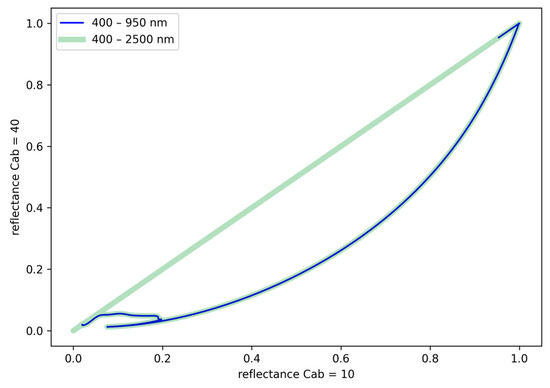 Having understood the importance of the Cab parameter, we are in a position to trace the origin of the nearly mathematically perfect pattern observed in the (rescaled) reflectance-against-reflectance curves, deduced from the observed reflectance signatures in, e.g., Figure 6 and Figure 7. To this end, we plot a (rescaled) reflectance-against-reflectance curve derived from PROSAIL, keeping all parameters the same, except Cab, for which the larger value is put on the y-axis, as shown in Figure 22. The result is the pattern we have noticed in the observed curves in Figure 6 and Figure 7.