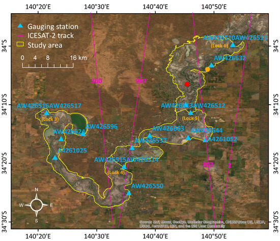 The Murray River is Australia’s longest river (2508 km in length; https://www.ga.gov.au/scientific-topics/national-location-information/landforms/longest-rivers, accessed on 1 October 2023). It begins in the southeastern Alps, drains the western side of the Great Dividing Range, and then meanders northwest across inland plains, forming the border between the states of New South Wales and Victoria. The Murray River finally flows via South Australia (SA) with its mouth in the Southern Ocean. Our focus is on the low-gradient main channel of the Lower Murray River in SA. This part of the river has a complex channel system providing the most challenging test of our proposed method. The river is highly regulated with numerous structures including weirs and locks constructed along the channel. Our study area starts upstream near Weir and Lock No. 6 at Murtho, and ends at Weir and Lock No. 3 at Overland Corner (Figure 1). The river length is approximately 153.2 km, and the catchment area is about 646.5 km2. There is no distinct rainy season, and the mean annual rainfall is very low (about 300 mm/year). High flow generally occurs between August and October. However, stream flow is not representative of local rainfall due to high regulation. There are a total of 14 hydrological gauging stations distributed along this portion of the river. Figure 1 shows the locations of 10 selected stream gauges with water level data coincident with the satellite overpass for comparison.