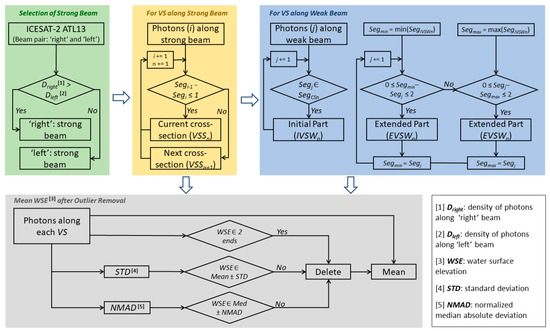 Therefore, the aim of this study is to achieve improvements in the mean WSE accuracy at each VS by removing the inherent errors and systematic bias caused by the inclusion of land outliers from the ATL13 dataset. Our objectives are twofold: Firstly, to develop an automated method for selecting photon points wholly located on the water surface at a VS through effective beam/track segmentation (hereinafter referred to as “auto-segmentation”). Secondly, to explore the effect of different approaches to calculating the mean WSE value at a VS after the auto-segmentation processing. We evaluated the accuracy of automating the mean WSE estimation at selected VSs through a comparison with water level observations from nearby ground gauging stations. These are important steps towards the accurate retrieval of hydraulic parameters, such as river depth, which are often unobserved or unobservable at relevant spatial scales.