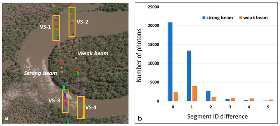 The downloaded dataset was broken into segments with non-unique integer IDs for the water/land transition. The ICESAT-2 sensor contains three parallel beam pairs, each with a strong beam and a weak beam (Figure 3a). Both the strong and weak beams consist of segments and share the same IDs. The weak beam has more discontinuities in its segment indexation than the strong beam, while the strong beam always has more segments (fewer gaps in segment indexation) and therefore a higher density of photons than the weak beam [34]. Each segment has multiple photons with the same segment ID. Given that a beam can contain multiple VSs, our key task was to split multiple VSs by defining the beginning and end edges of a VS where only individual beams intersected a contiguous water body. This enabled the extraction of the true representation of water height at that VS. Investigation of the distribution of the non-contiguous segment IDs (Figure 3b) showed that most segment ID differences between adjacent photons were ≤1 for strong beams (about 90%) and ≤2 for weak beams (about 80%). Therefore, we developed an auto-segmentation method reflecting this insight (Figure 4). In the process, we applied the following rules: