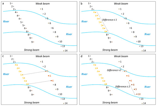 Illustration of the auto-segmentation process. Photons are presented as dots. Grey and coloured dots show before and after auto-segmentation, respectively. The number next to each dot is the segment ID of the photon. (a) Pair of beams at the two VSs. (b) The result of applying Rule 1 to the strong beam. (c) The result of applying the first step of Rule 2 to the weak beam. (d) The result of applying the second step of Rule 2 to the weak beam.