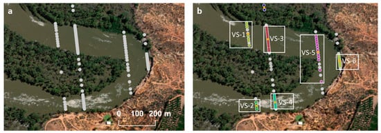 There are marked (but non-uniform) differences (Figure 6) between the calculated mean WSE values before (grey dots) and after (coloured dots) the auto-segmentation process at selected VSs. The results (Figure 6a) show that the before and after mean WSE values are the same at both VS-1 and VS-5, where the numbers of grey and coloured dots along each track are similar and they are all over water. There are, however, differences between the before and after mean WSE values at VS-2, VS-3, VS-4 and VS-6. These differences arise from the involvement of those extra grey dots (i.e., over land), especially at each end of the VS (Figure 5). In general, the mean standard deviation of the four VSs decreases substantially from 0.35 m (Before) to 0.06 m (After). The significantly lower or smaller values after auto-segmentation indicate that the previously dispersed data (less reliable) are clustered more tightly around the mean (more reliable) than before. Taking VS-4 as an example (Figure 6b), the difference in the mean WSE before (16.751 m) and after (16.500 m) the auto-segmentation at this VS is 25.1 cm due to the inclusion of the outliers at the two ends of the VS. The inferred water surface width (defined by green dots) is 50% narrower than before (defined by grey dots). These further demonstrate that the auto-segmentation process plays an important role in the accurate derivation of the mean WSE at each VS.