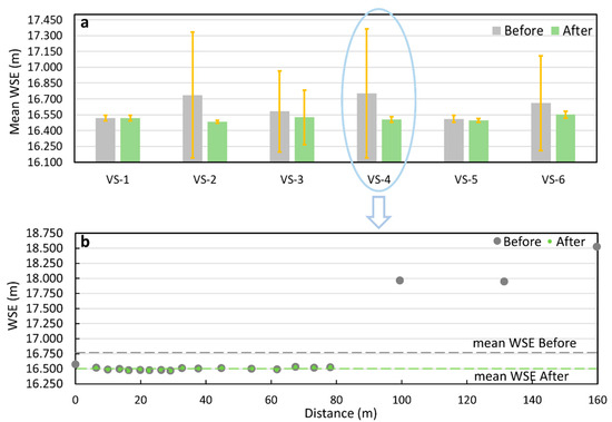 Examples of mean WSE values at selected VSs (in Figure 5) before and after auto-segmentation processing: (a) mean and standard deviation of WSE values at six selected VSs, and (b) mean WSE derivation at VS-4 (blue circle in (a)). Grey dots are segments used to calculate the mean WSE Before (grey dashed line), and green dots are segments used to calculate the mean WSE After (green dashed line).
